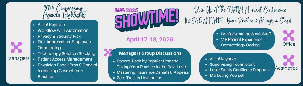 Welcome to the Dermatology Managers AssociationPromoting the advancement of Dermatology and Aesthetic practices through ongoing education, innovative business strategies, and professional networking avenues.DMA, a non-profit, 501(c)(3) association, aims to provide resources and educational platforms to dermatology and aesthetic medical practices. Our support extends to all office staff members including providers, administrators, managers, aesthetic services, and front and back office personnel. Click here to Preview 2026 Keynote speaker! Attendee Registration NOW OPEN!!! Join us for